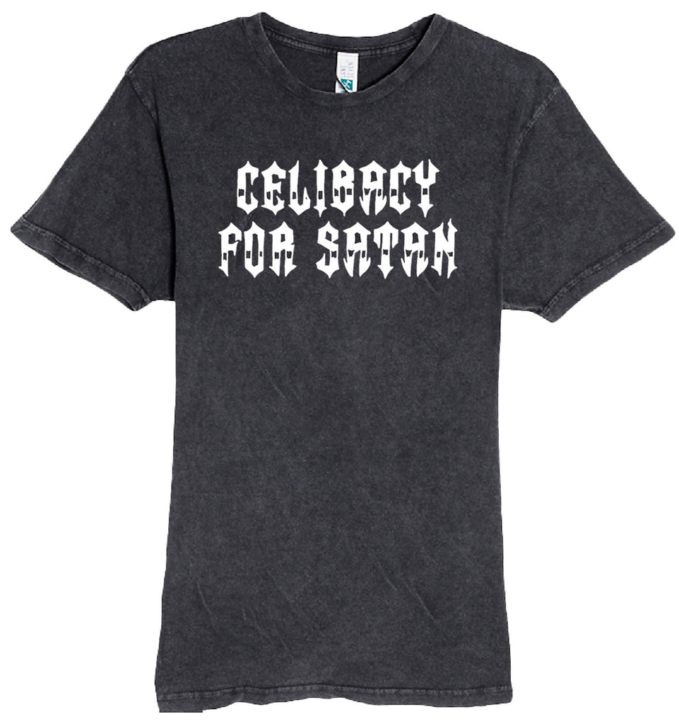 Please note that this shirt is in Cloud Black with the text "Celibacy for Satan" in white font.